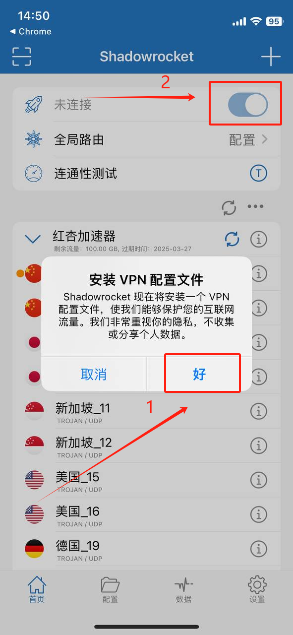 系统自动导入后,第一步安装VPN配置文件,选择好,第二步打开连接按钮