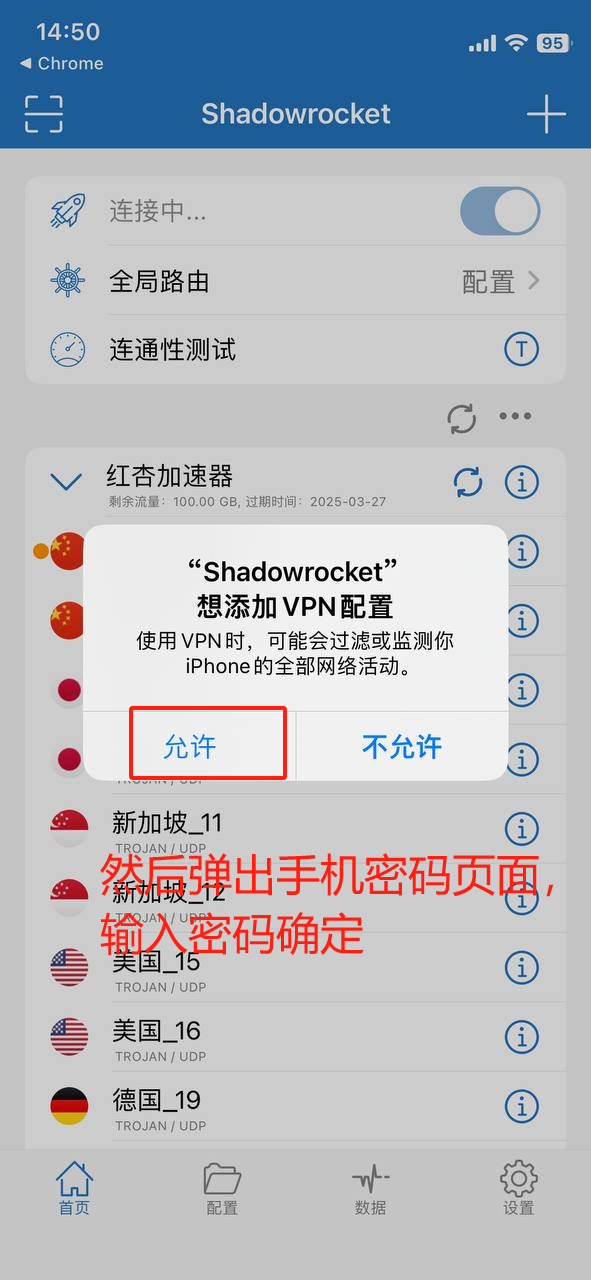 接下来允许添加VPN配置文件,并且输入手机密码确认